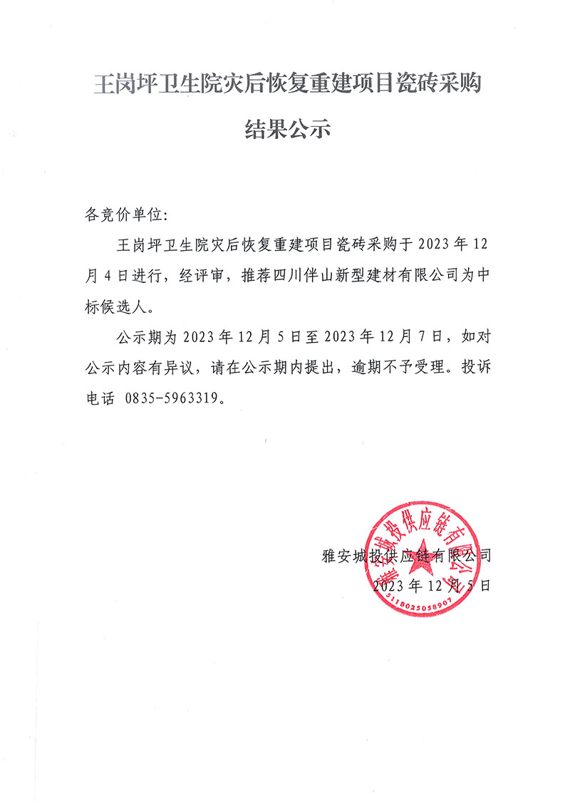 王崗坪衛(wèi)生院災(zāi)后恢復(fù)重建項(xiàng)目瓷磚采購結(jié)果公示