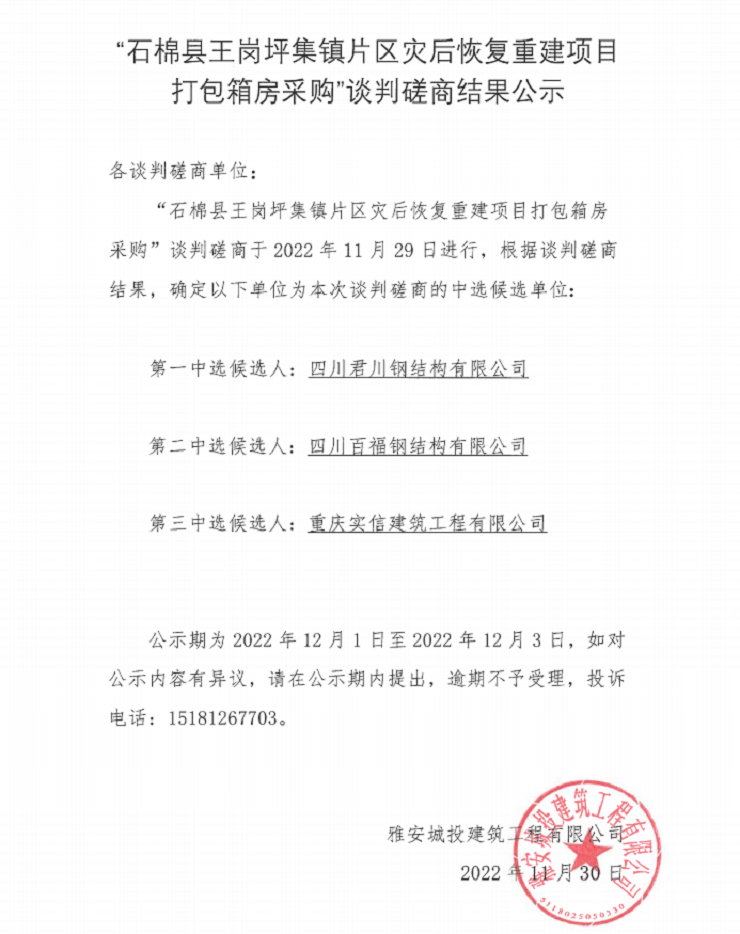 “石棉縣王崗坪集鎮(zhèn)片區(qū)災后恢復·重建項目打包箱房采購”談判磋商結(jié)果公示