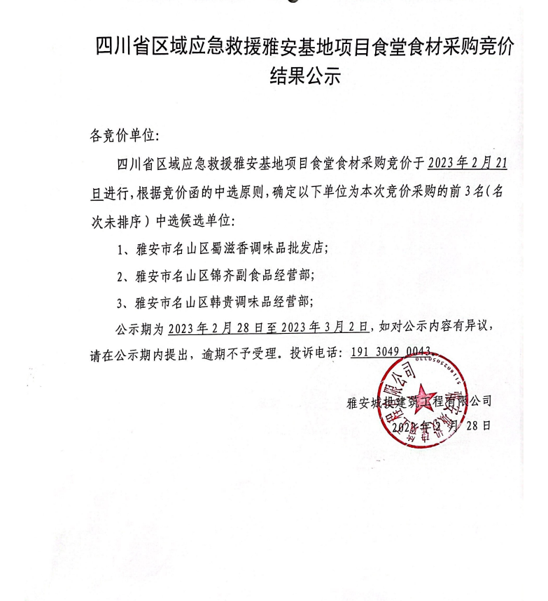 四川省區(qū)域應(yīng)急救援雅安基地項(xiàng)目食堂食材采購競價(jià)結(jié)果公示