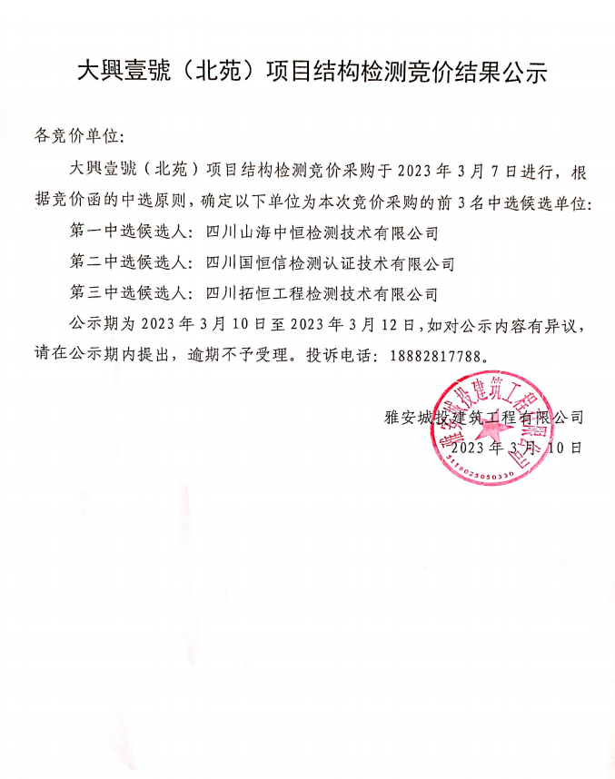 大興壹號(北苑)項目結(jié)構(gòu)檢測競價結(jié)果公示