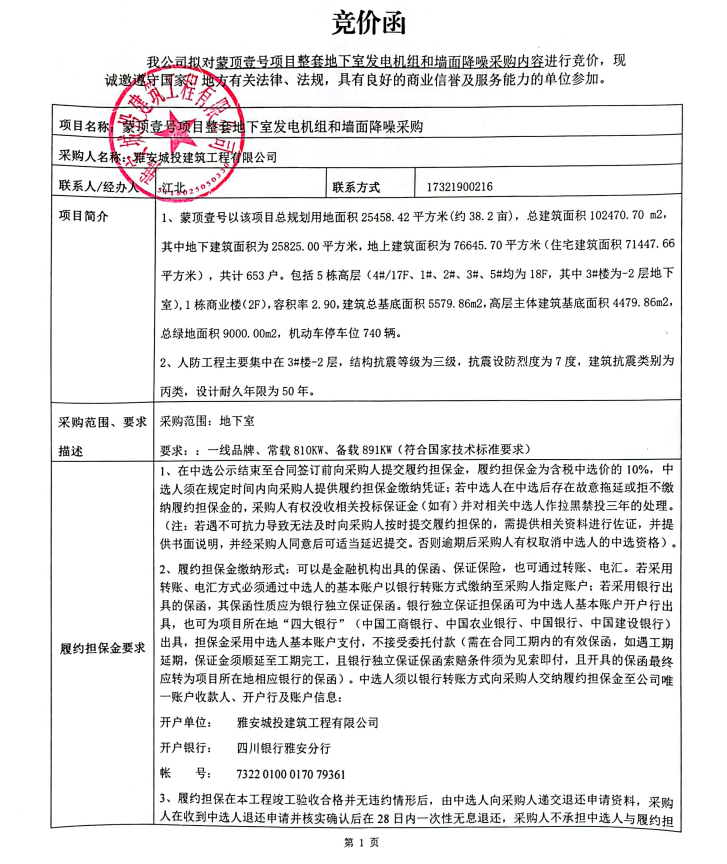 蒙頂壹號項目整套地下室發(fā)電機組和墻面降噪采購競價公告