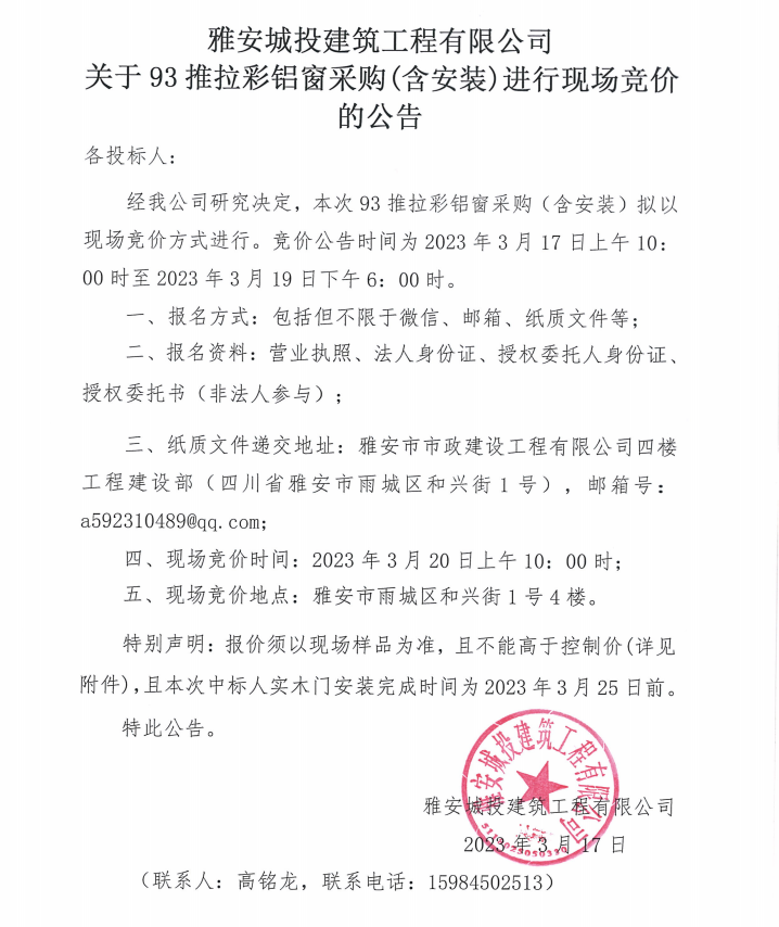 雅安城投建筑工程有限公司關(guān)于93推拉彩鋁窗采購(含安裝)進(jìn)行現(xiàn)場競價的公告