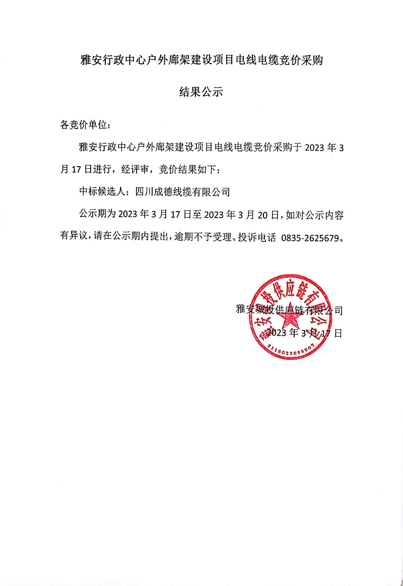 雅安行政中心戶外廊架建設(shè)項(xiàng)目電線電纜競(jìng)價(jià)采購結(jié)果公示