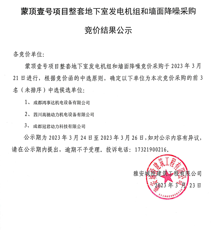 蒙頂壹號項(xiàng)目整套地下室發(fā)電機(jī)組和墻面降噪采購競價(jià)結(jié)果公示
