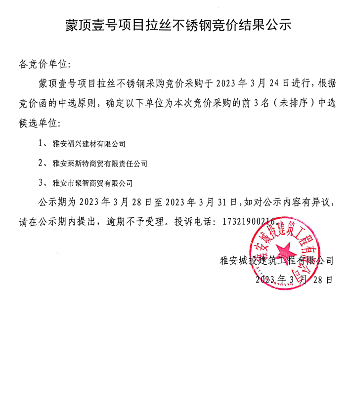 蒙頂壹號項目拉絲不銹鋼競價結果公示