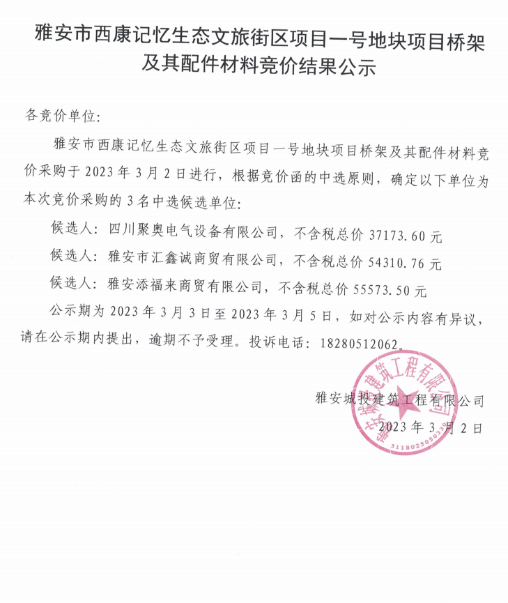 雅安市西康記憶生態(tài)文旅街區(qū)項(xiàng)目一號地塊項(xiàng)目橋架及其配件材料競價(jià)結(jié)果公示