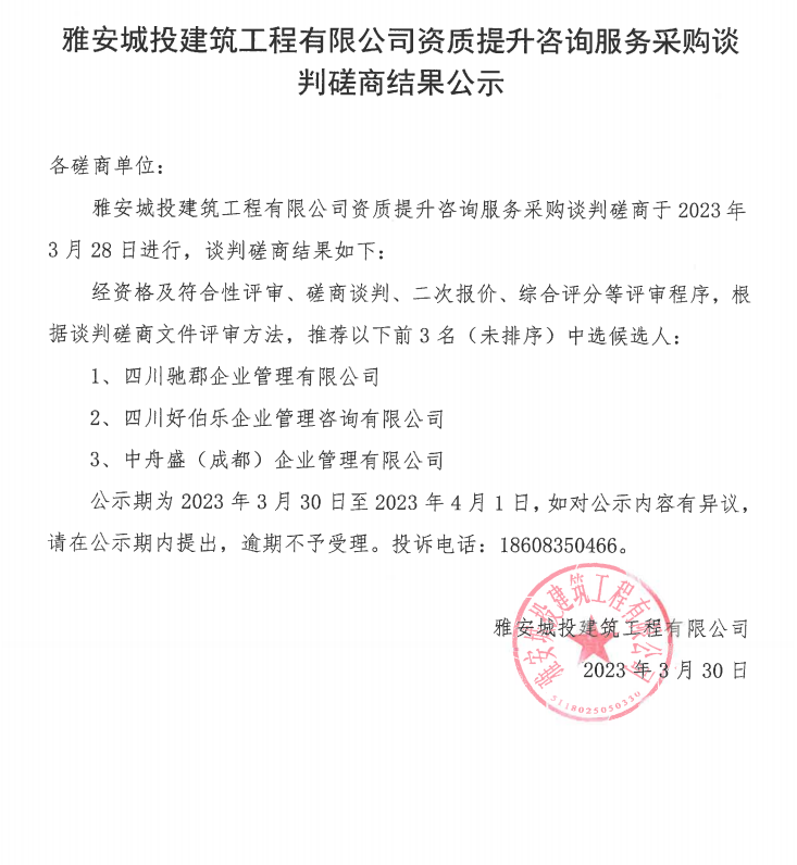 雅安城投建筑工程有限公司資質(zhì)提升咨詢服務(wù)采購談判磋商結(jié)果公示