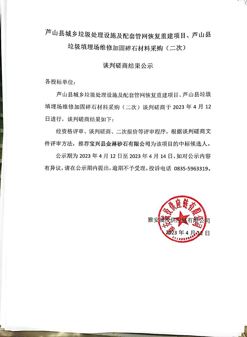 蘆山縣城鄉(xiāng)垃圾處理設(shè)施及配套管網(wǎng)恢復(fù)重建項目、蘆山縣垃圾填埋場維修加固碎石材料采購(二次)談判磋商結(jié)果公示