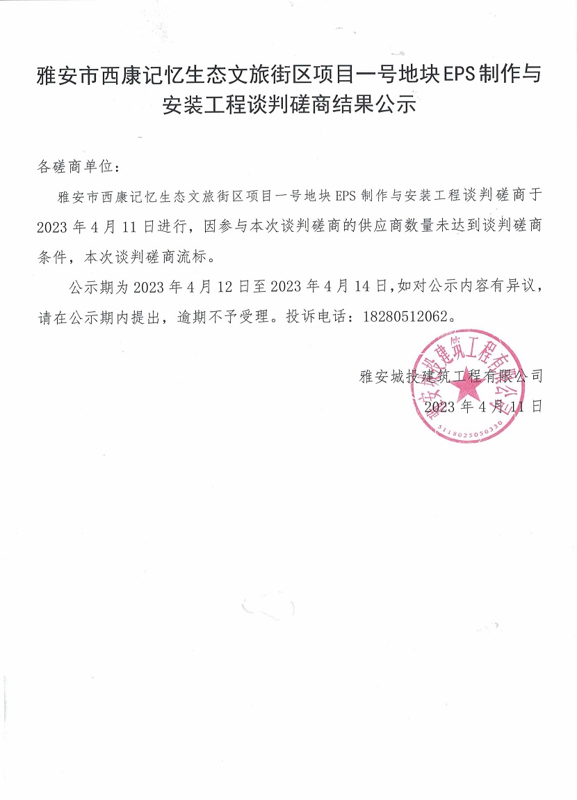 雅安市西康記憶生態(tài)文旅街區(qū)項目一號地塊EPS制作與安裝工程談判磋商結(jié)果公示