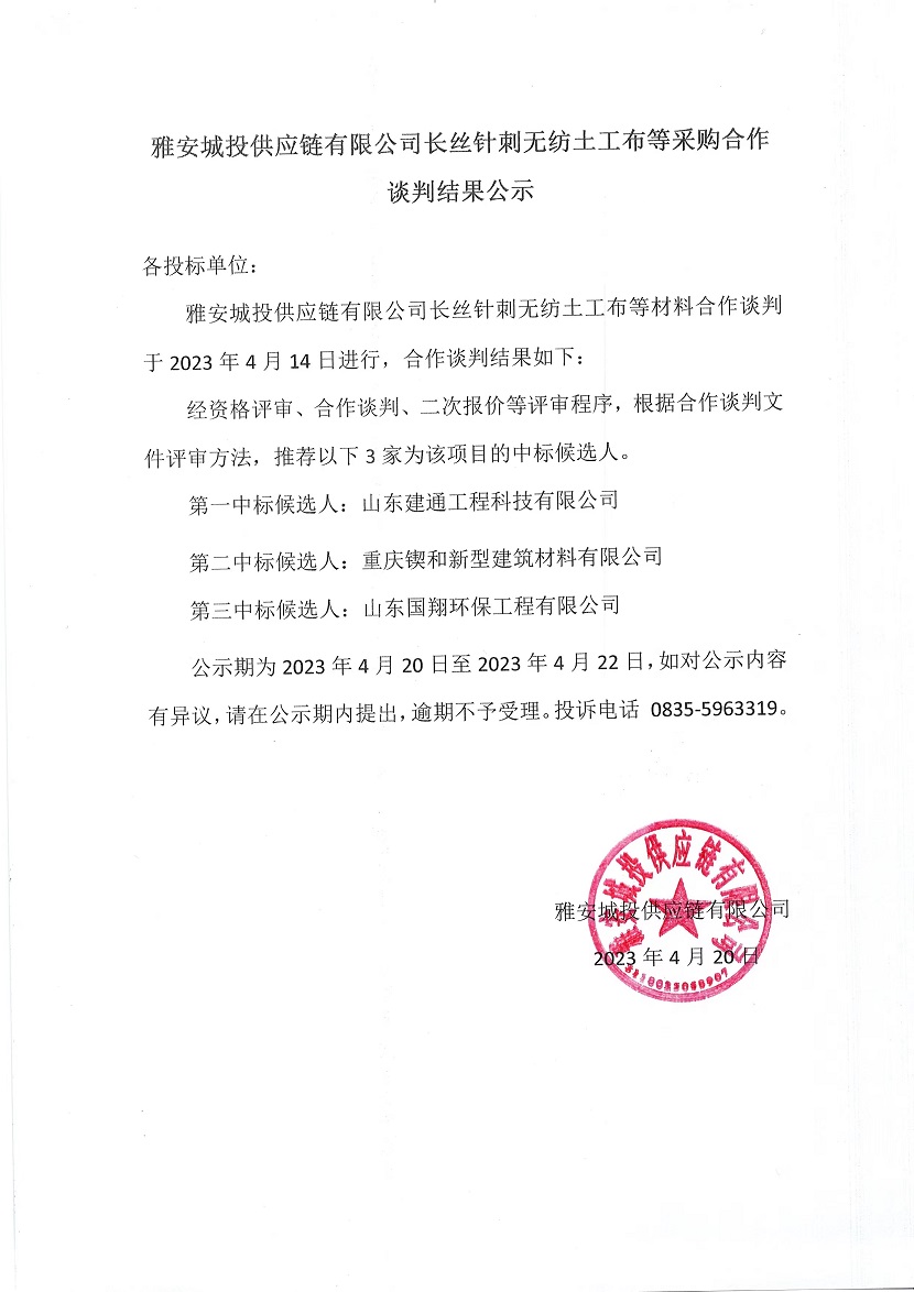 雅安城投供應(yīng)鏈有限公司長絲針刺無紡?fù)凉げ嫉炔少徍献髡勁薪Y(jié)果公示