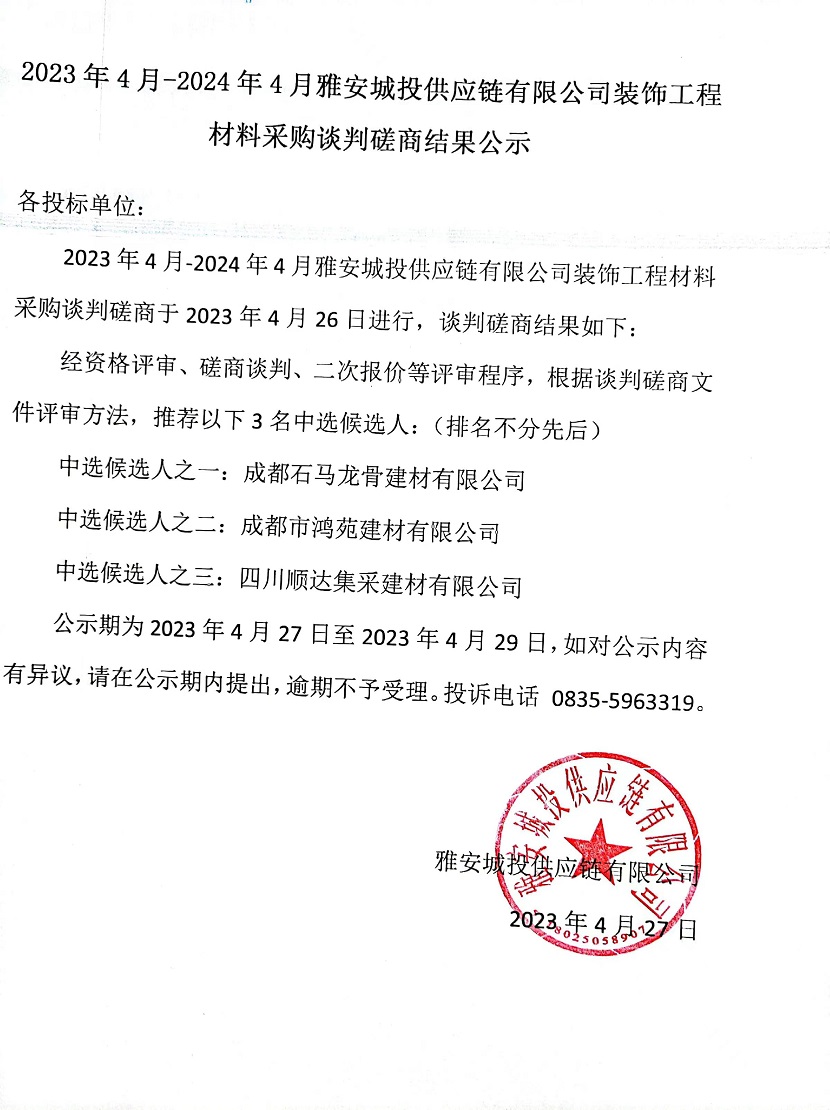 2023年4月-2024年4月雅安城投供應(yīng)鏈有限公司裝飾工程材料采購談判磋商結(jié)果公示