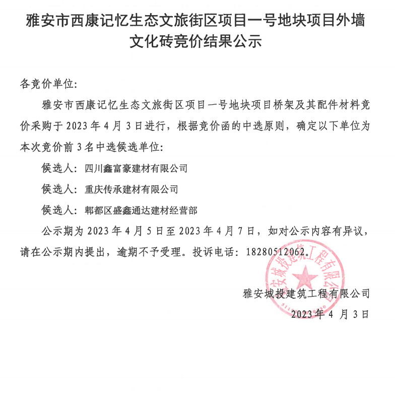 雅安市西康記憶生態(tài)文旅街區(qū)項(xiàng)目一號(hào)地塊項(xiàng)目外墻文化磚競價(jià)結(jié)果公示
