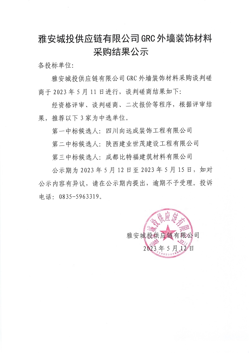 雅安城投供應鏈有限公司GRC外墻裝飾材料采購結(jié)果公示