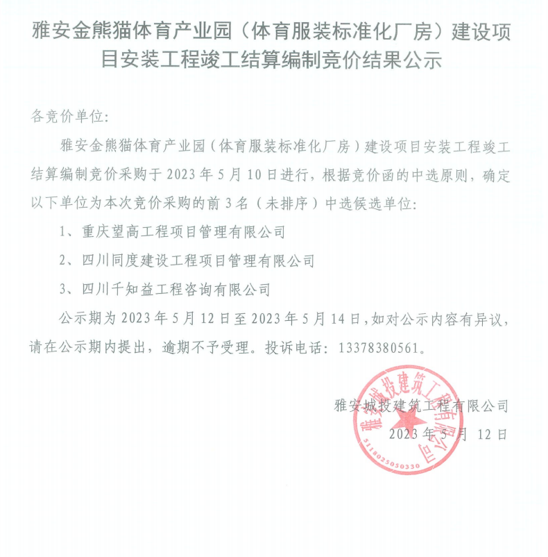 雅安金熊貓?bào)w育產(chǎn)業(yè)園(體育服裝標(biāo)準(zhǔn)化廠房)建設(shè)項(xiàng)目安裝工程結(jié)算編制競價(jià)結(jié)果公示