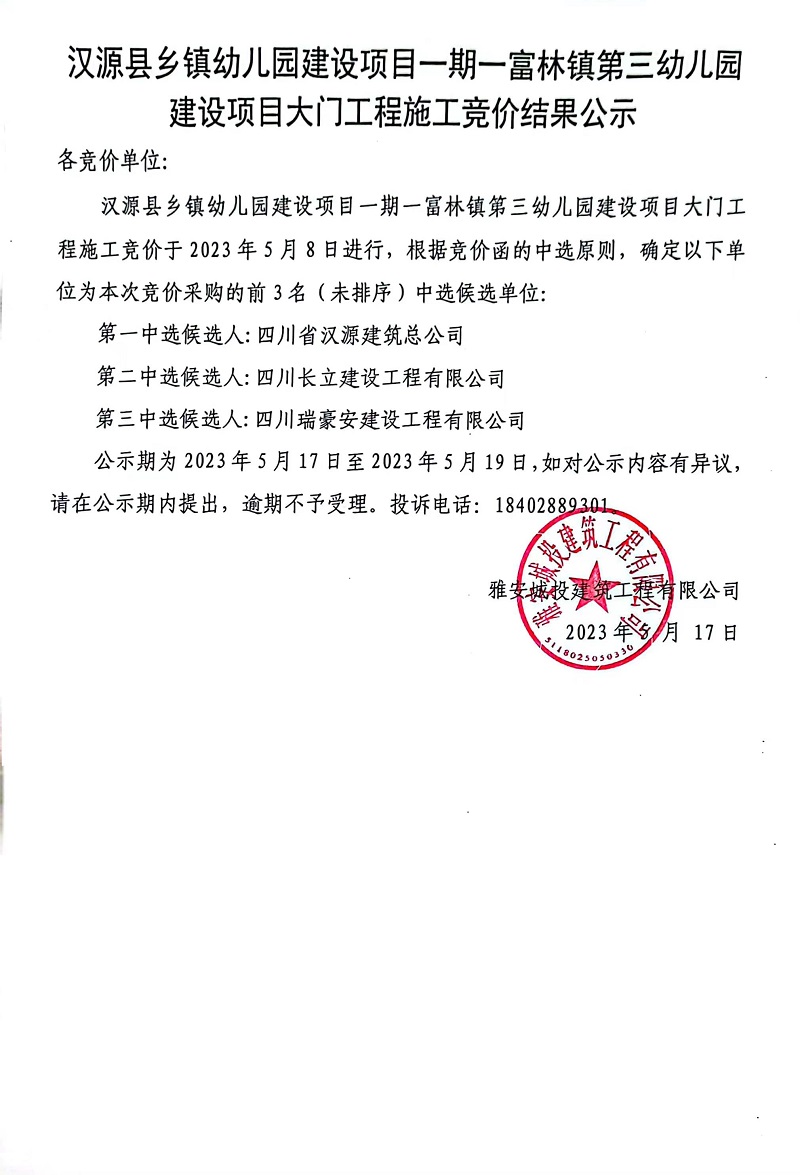 漢源縣鄉(xiāng)鎮(zhèn)幼兒園建設(shè)項(xiàng)目一期一富林鎮(zhèn)第三幼兒園建設(shè)項(xiàng)目大門工程施工競價(jià)結(jié)果公示