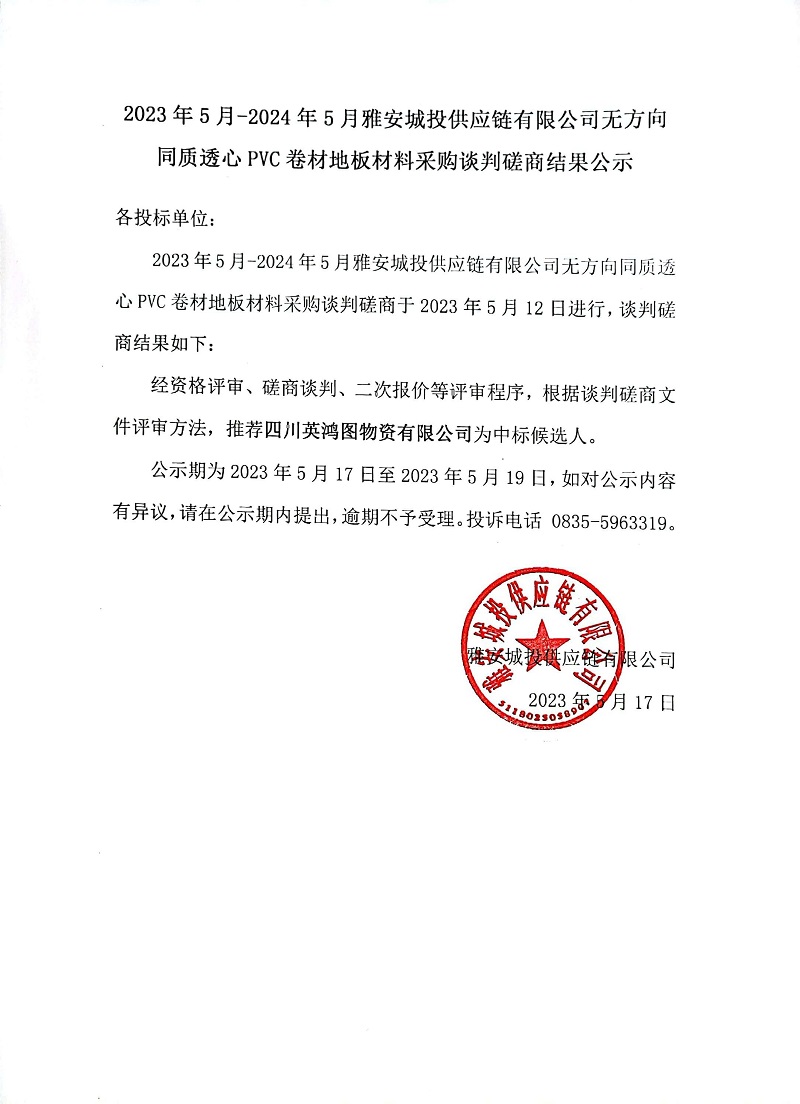 2023年5月-2024年5月雅安城投供應(yīng)鏈有限公司無(wú)方向同質(zhì)透心PVC卷材地板材料采購(gòu)談判磋商結(jié)果公示