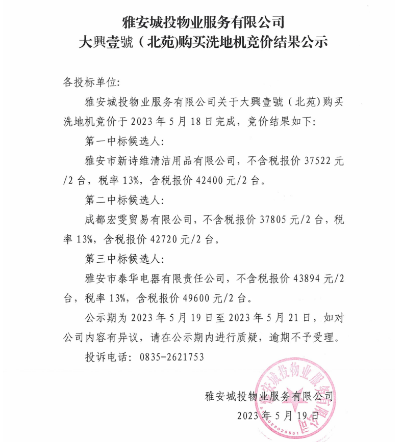 雅安城投物業(yè)服務(wù)有限公司大興壹號(北苑)購買洗地機競價結(jié)果公示