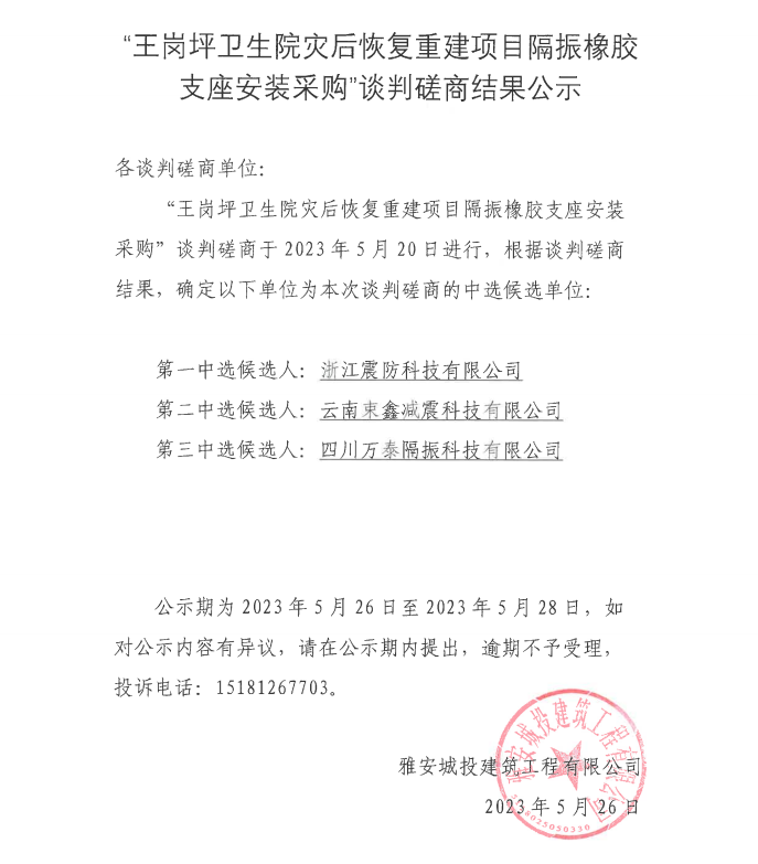 “王崗坪衛(wèi)生院災后恢復重建項目隔振橡膠支座安裝采購”談判磋商結(jié)果公示