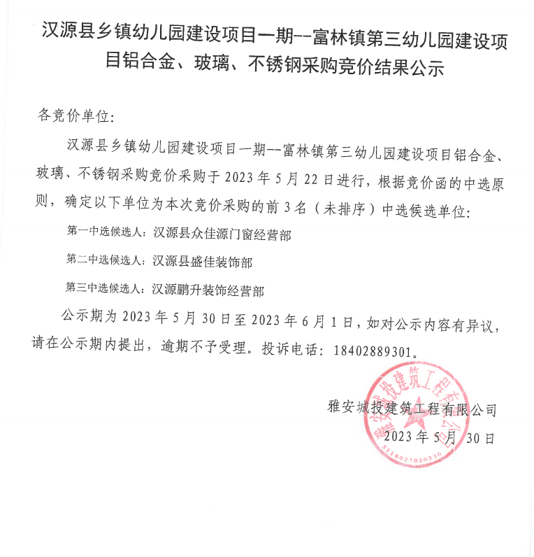 漢源縣鄉(xiāng)鎮(zhèn)幼兒園建設(shè)項(xiàng)目一期--富林鎮(zhèn)第三幼兒園建設(shè)項(xiàng)目鋁合金、玻璃、不銹鋼采購競(jìng)價(jià)結(jié)果公示
