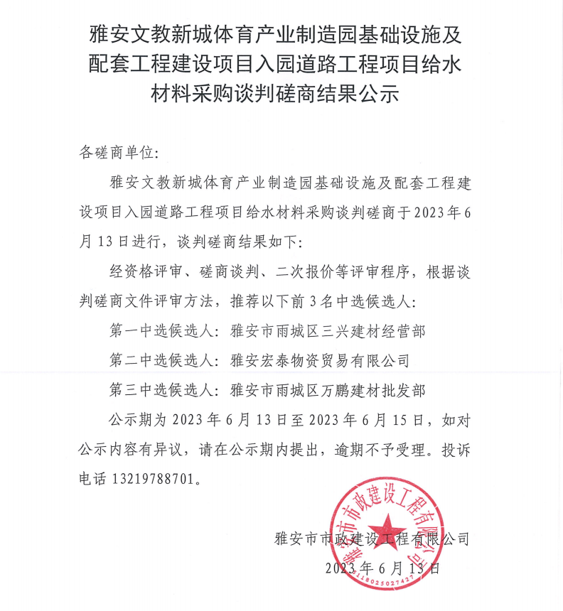 雅安文教新城體育產(chǎn)業(yè)制造園基礎(chǔ)設(shè)施及配套工程建設(shè)項(xiàng)目入園道路工程項(xiàng)目給水材料采購(gòu)談判磋商結(jié)果公示