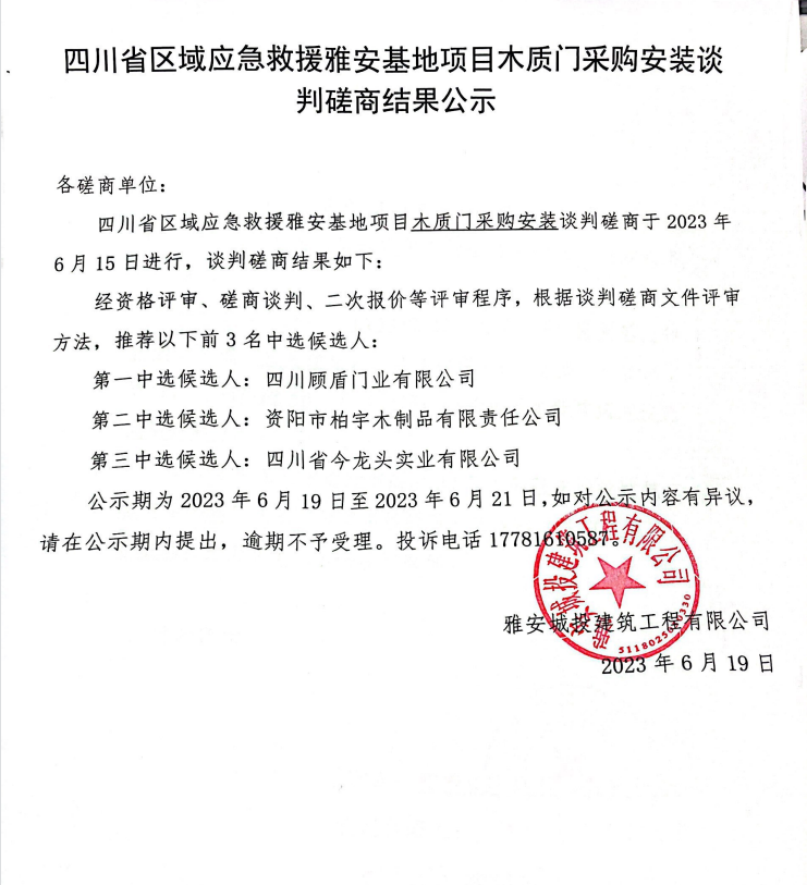 四川省區(qū)域應(yīng)急救援雅安基地項(xiàng)目木質(zhì)門采購安裝談判磋商結(jié)果公示