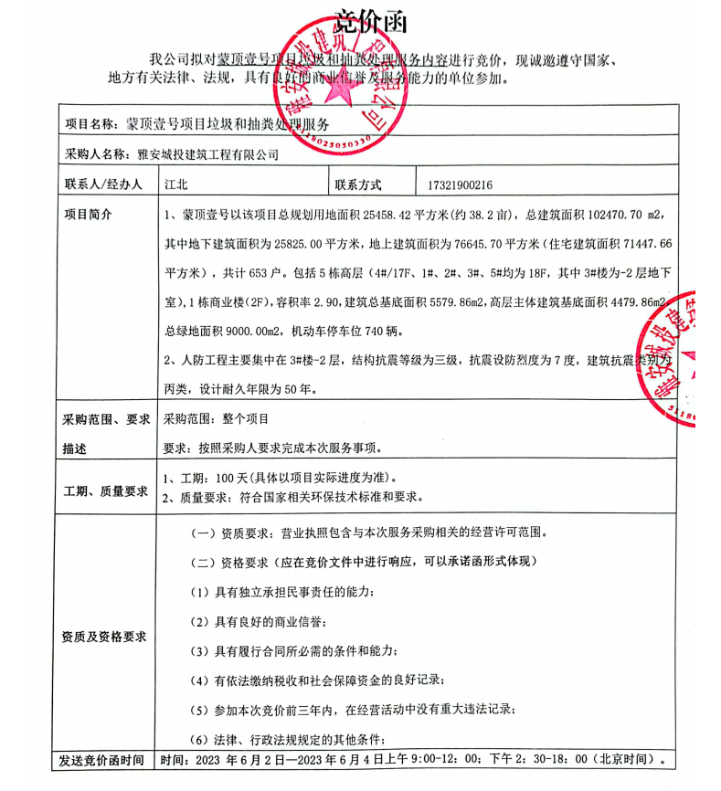 蒙頂壹號(hào)項(xiàng)目垃圾和抽糞處理服務(wù)競(jìng)價(jià)公告