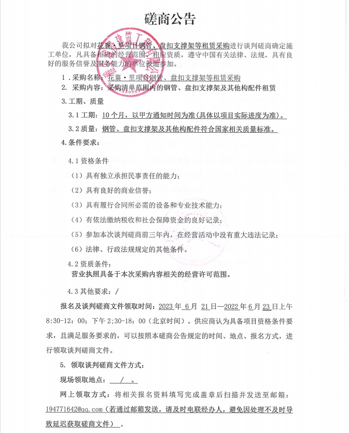 花襄·里項目鋼管、盤扣支撐架等租賃采購談判磋商公告