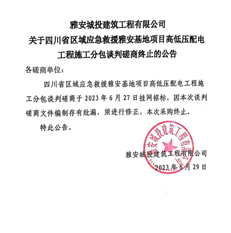 雅安城投建筑工程有限公司關(guān)于四川省區(qū)域應(yīng)急救援雅安基地項(xiàng)目高低壓配電工程施工分包談判磋商終止的公告