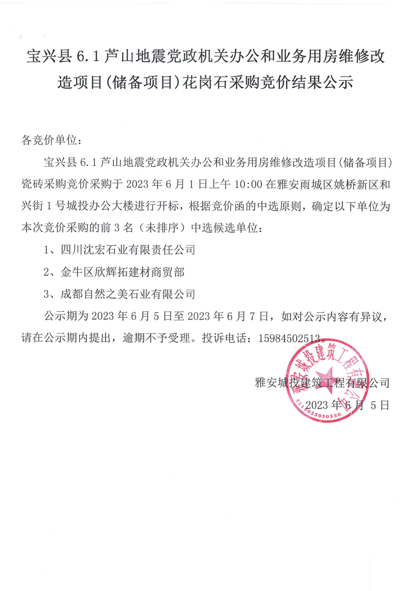 寶興縣6.1蘆山地震黨政機關(guān)辦公和業(yè)務(wù)用房維修改造項目(儲備項目)花崗石采購競價結(jié)果公示