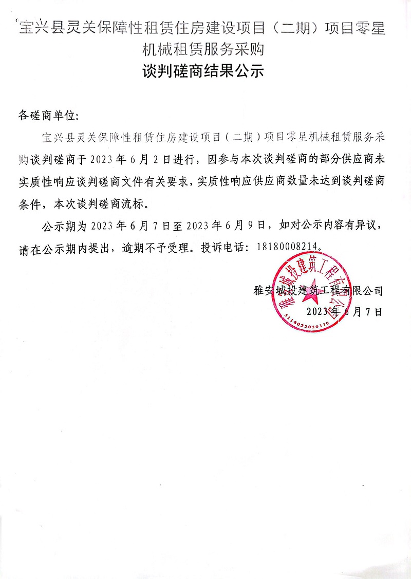 寶興縣靈關(guān)保障性租賃住房建設(shè)項(xiàng)目(二期)項(xiàng)目零星機(jī)械租賃服務(wù)采購談判磋商結(jié)果公示
