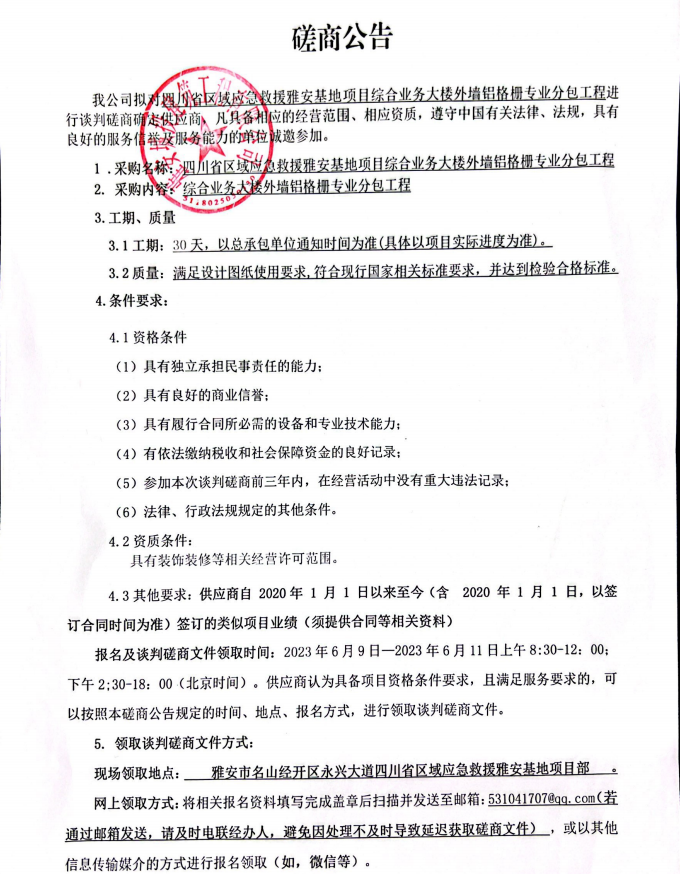 四川省區(qū)域應急救援雅安基地項目綜合業(yè)務大樓外墻鋁格柵專業(yè)分包工程談判磋商公告