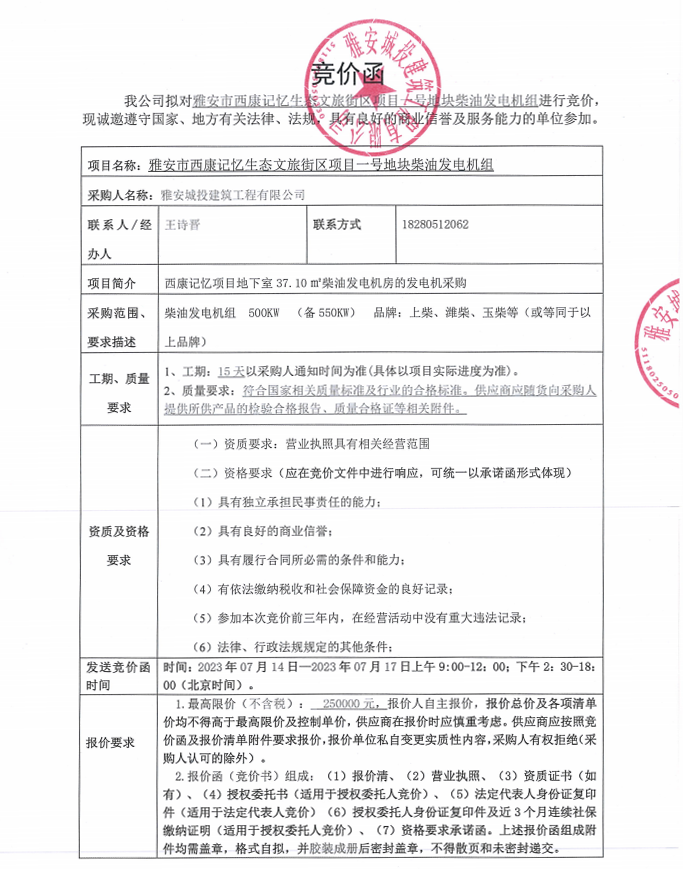 雅安市西康記憶生態(tài)文旅街區(qū)項(xiàng)目一號(hào)地塊柴油發(fā)電機(jī)組競價(jià)采購公告