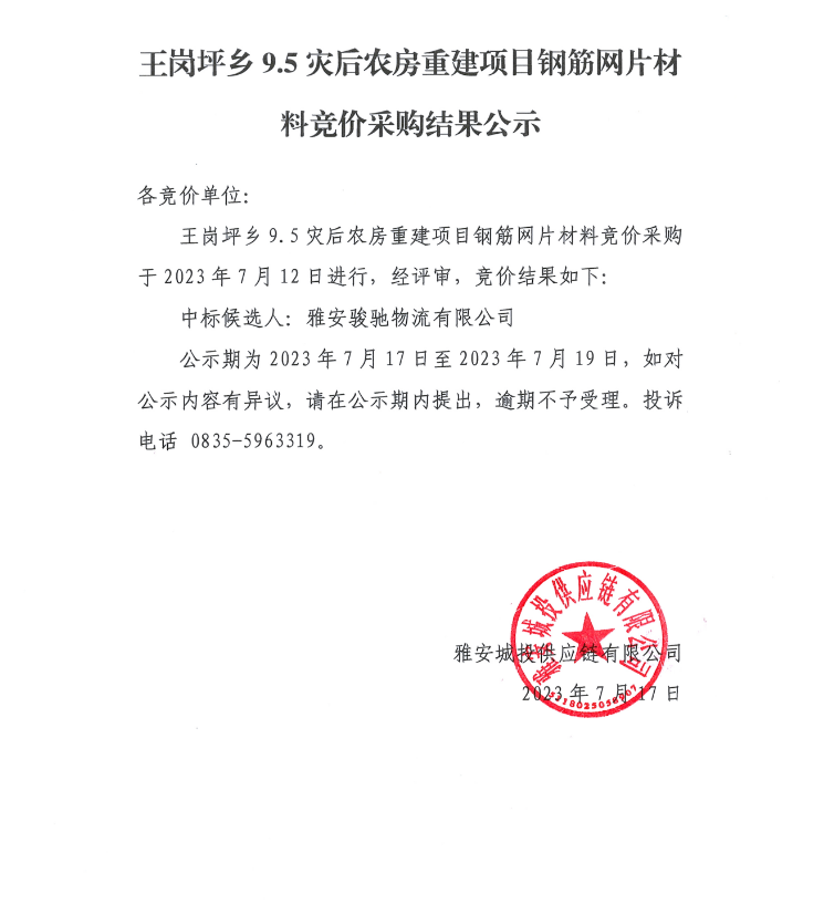 王崗坪鄉(xiāng)9.5災(zāi)后農(nóng)房重建項(xiàng)目鋼筋網(wǎng)片材料競(jìng)價(jià)采購(gòu)結(jié)果公示