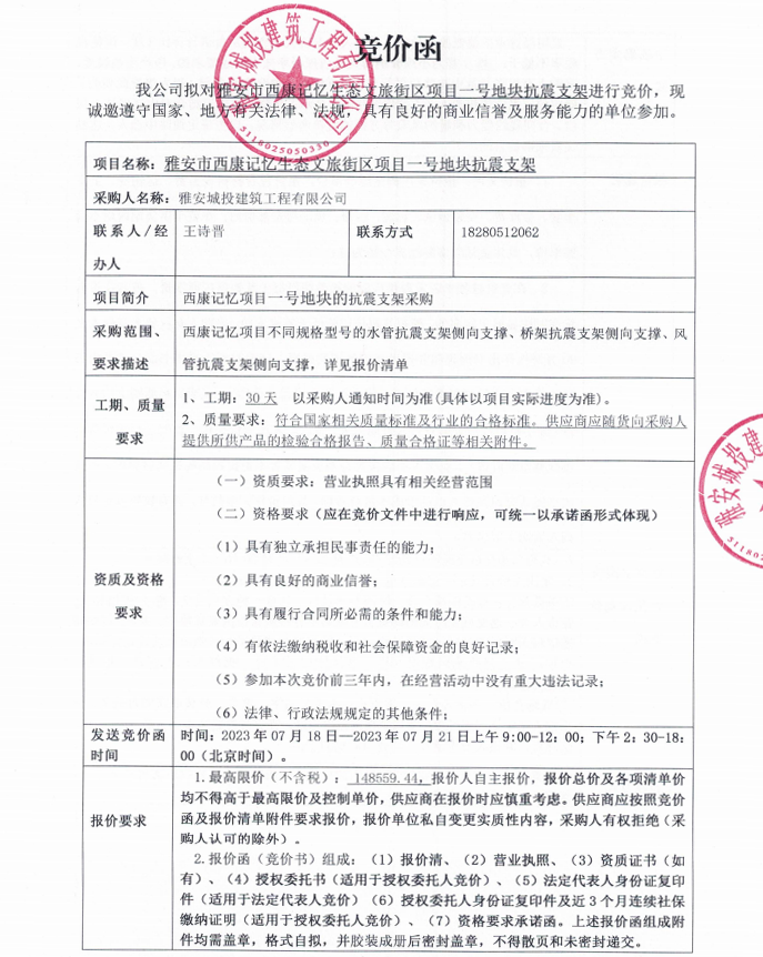 雅安市西康記憶生態(tài)文旅街區(qū)項(xiàng)目一號地塊抗震支架競價(jià)采購公告