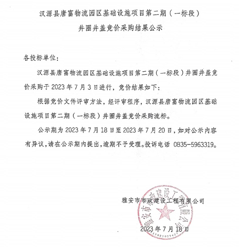 漢源縣唐富物流園區(qū)基礎(chǔ)設(shè)施項目第二期(一標(biāo)段)井圈井蓋競價采購結(jié)果公示
