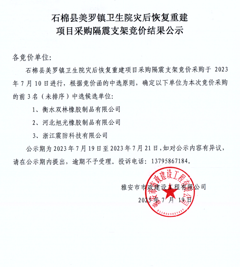 石棉縣美羅鎮(zhèn)衛(wèi)生院災(zāi)后恢復(fù)重建項(xiàng)目采購(gòu)隔震支架競(jìng)價(jià)結(jié)果公示
