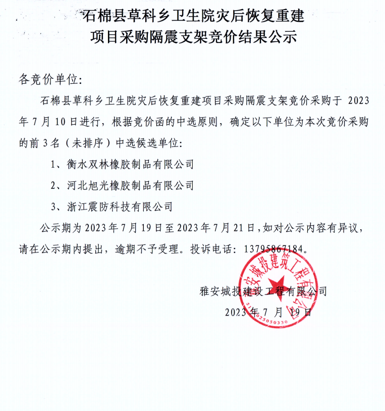 石棉縣草科鄉(xiāng)衛(wèi)生院災(zāi)后恢復(fù)重建項(xiàng)目采購(gòu)隔震支架競(jìng)價(jià)結(jié)果公示