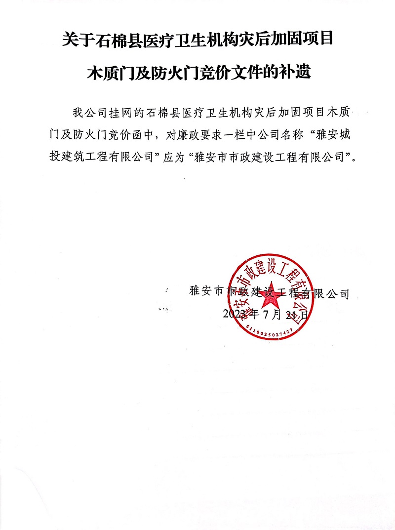 關(guān)于石棉縣醫(yī)療衛(wèi)生機構(gòu)災(zāi)后加固項目木質(zhì)門及防火門競價文件的補遺