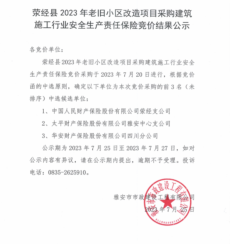 滎經(jīng)縣2023年老舊小區(qū)改造項目采購建筑施工行業(yè)安全生產(chǎn)責(zé)任保險競價結(jié)果公示