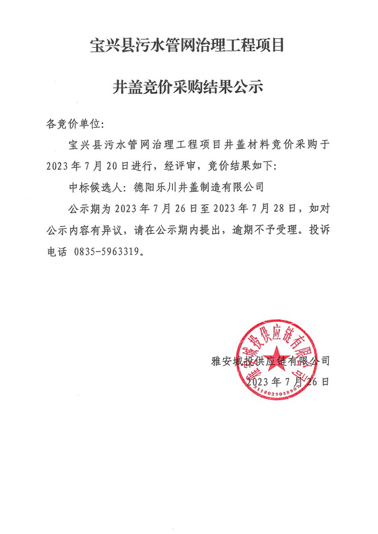 寶興縣污水管網(wǎng)病害治理工程項(xiàng)目井蓋競價(jià)采購結(jié)果公示