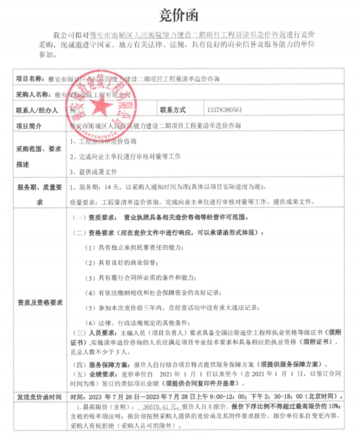 雅安市雨城區(qū)人民醫(yī)院能力建設(shè)二期項(xiàng)目工程量清單造價(jià)咨詢競價(jià)公告