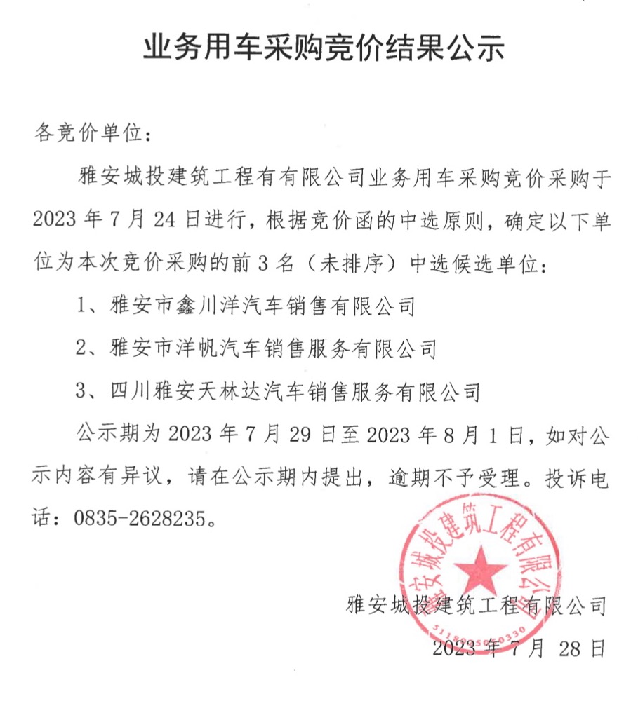 業(yè)務用車采購競價結(jié)果公示