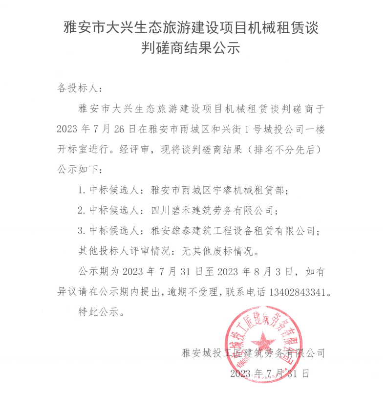 雅安市大興生態(tài)旅游建設項目機械租賃談判磋商結果公示