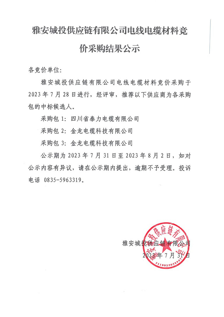 雅安城投供應(yīng)鏈有限公司電線電纜材料競價(jià)采購結(jié)果公示