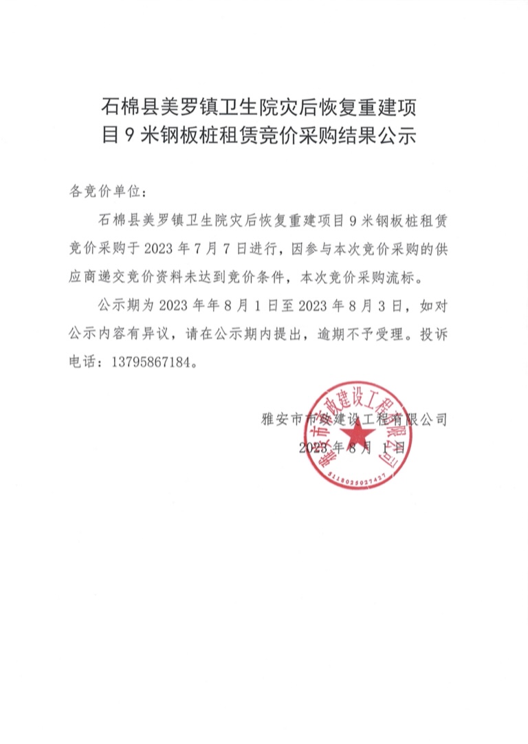 石棉縣美羅鎮(zhèn)衛(wèi)生院災(zāi)后恢復(fù)重建項目9米鋼板樁租賃競價采購結(jié)果公示