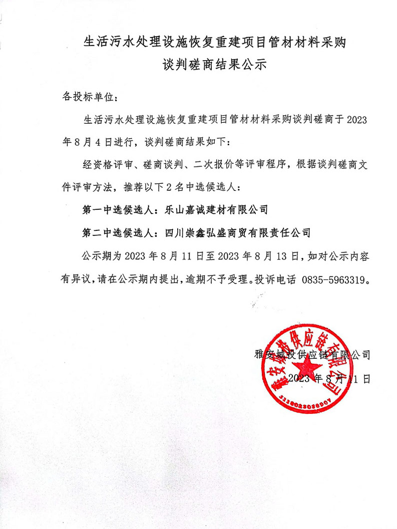 生活污水處理設(shè)施恢復(fù)重建項(xiàng)目管材材料采購(gòu)談判磋商結(jié)果公示