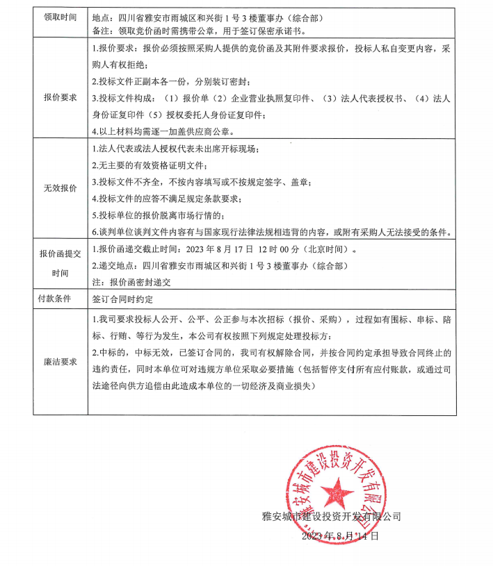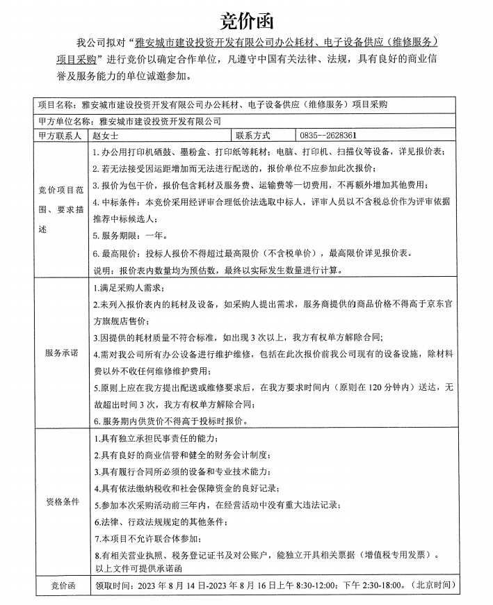 雅安城市建設(shè)投資開(kāi)發(fā)有限公司辦公耗材、電子設(shè)備供應(yīng)(維修服務(wù))項(xiàng)目采購(gòu)競(jìng)價(jià)公告