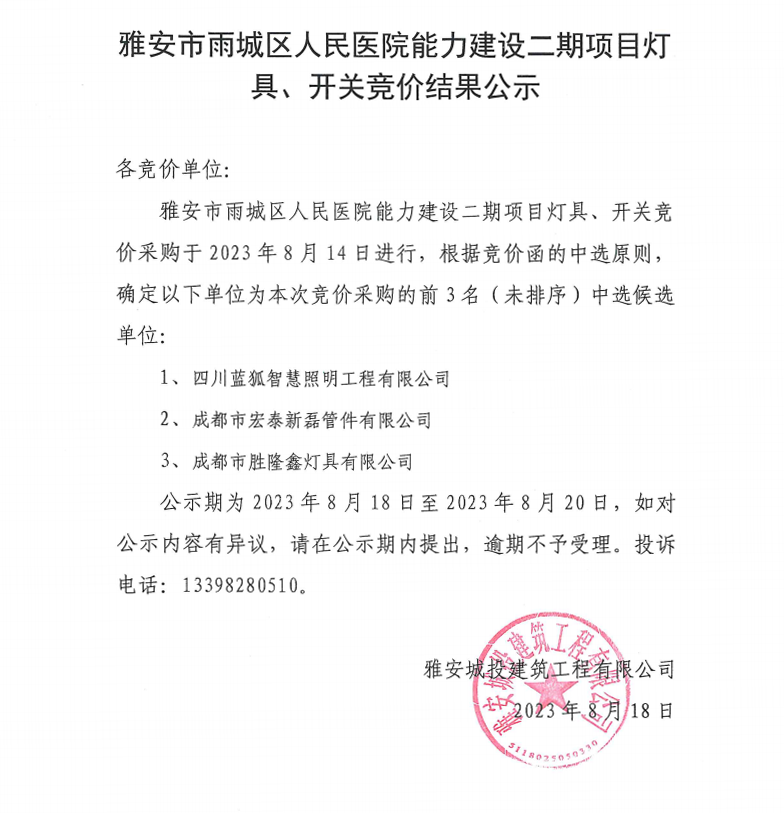 雅安市雨城區(qū)人民醫(yī)院能力建設(shè)二期項(xiàng)目燈具、開(kāi)關(guān)競(jìng)價(jià)結(jié)果公示