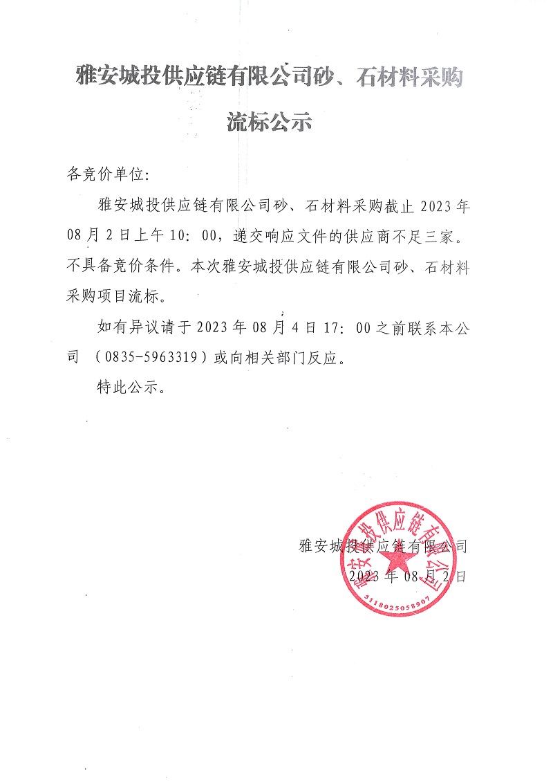 雅安城投供應(yīng)鏈有限公司砂、石材料采購流標(biāo)公示