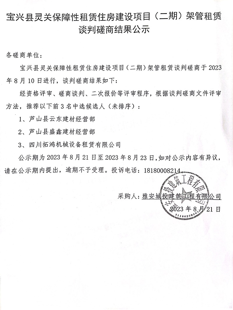 寶興縣靈關(guān)保障性租賃住房建設(shè)項(xiàng)目(二期)架管租賃談判磋商結(jié)果公示